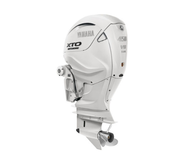 The Yamaha XF450ESA2 450hp XTO Offshore outboard with a 35" shaft delivers powerful performance for large boats. Its 5.6L V8 engine, direct injection, integrated electric steering, and Phase Angle Control charging system ensure precision, efficiency, and durability in a stylish white finish.